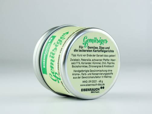 Verpackung | Lebensmittelechte lackierte Weißblechdose mit durchsichtigem Glas. Dose hat die Maße: 48x58 mm und wiegt leer 30 Gramm. Recyclingfähig über die gelbe Tonne. |